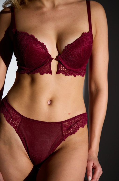 Ensemble lingerie dentelle bordeaux et string bonnet B marque Antime Lingerie.