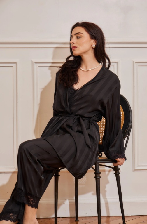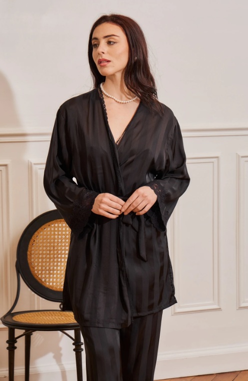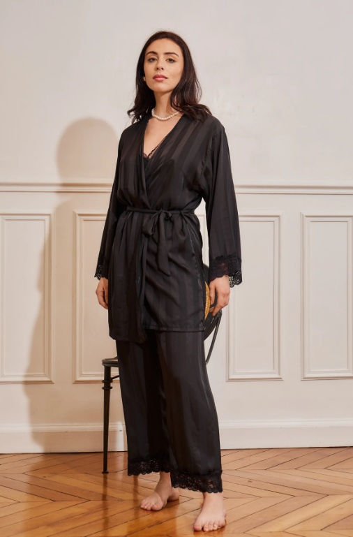 - le pyjama 3 pièces est idéal car il est complet avec son kimono que vous pouvez utiliser avec une autre tenue homewear. Et pourquoi pas en extérieur version chic tendance.