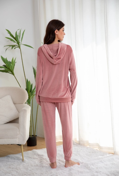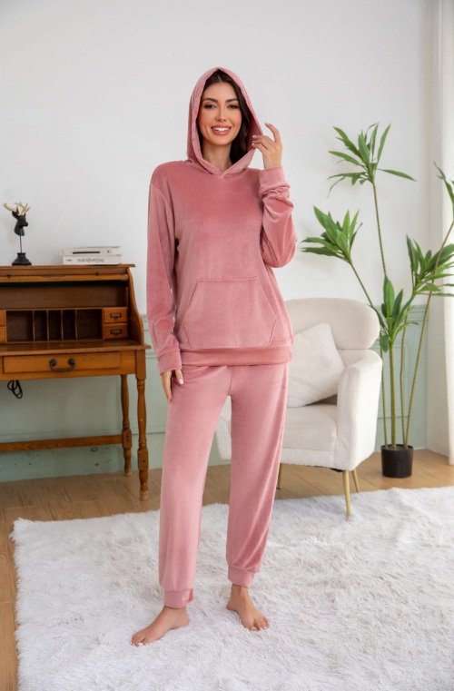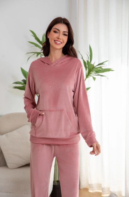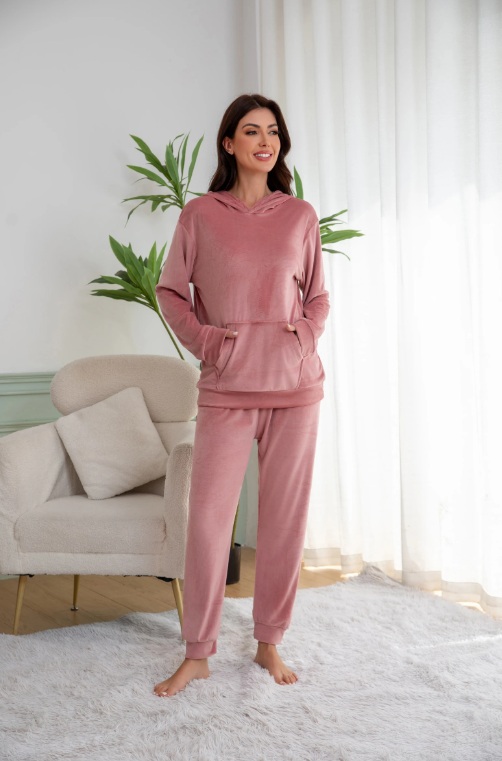 Pyjama Homewear pour femme en velours très doux, idéal pour automne/hiver. Sweat shirt avec capuche et poches avant. Pantalon agréable à porter avec taille élastiquée et serré à la cheville. Une petite marque Lili & Zoé. Retrouvez d’autres modèles de pyjamas parmi ma sélection.